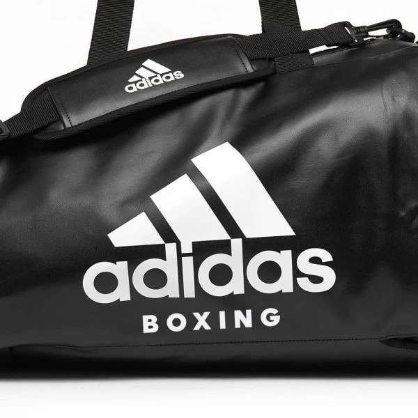 Adidas Boxing 2 in 1 Boxing Holdall – PU – Constructed from 100% strong and resistant PU with Nylon strap with single shoulder cushion on top and a side zipper pocket. This 2-in-1 holdall easily coverts into a backpack. Features a supersized black plastic zipper. Printed adidas logo on one side and printed stripes on the reverse side.