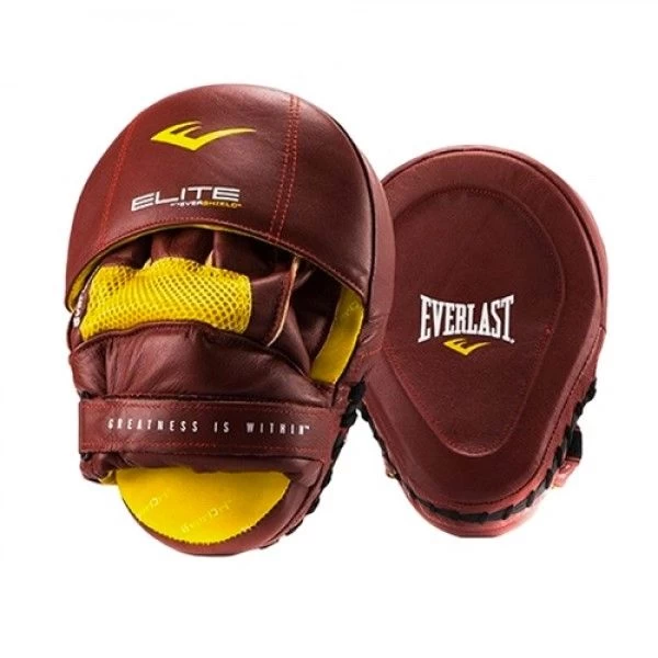 Everlast Elite Leather Punch Mitts –Â Part of the ELITE training line, the Mantis Mitts are designed with the coach in mind. Anatomically contoured hand design, additional gel lining and advanced multi-layered foam ensures hands, wrists and palms are supported and protected. A mesh outer pocket with EVERDRI technology keeps the trainers hands cool during intense training. The striking surface is constructed with premium full-grain leather for long lasting durability and includes a recessed striking target. Featuring a close finger design with a velcro wrist strap for improved safety and fit.